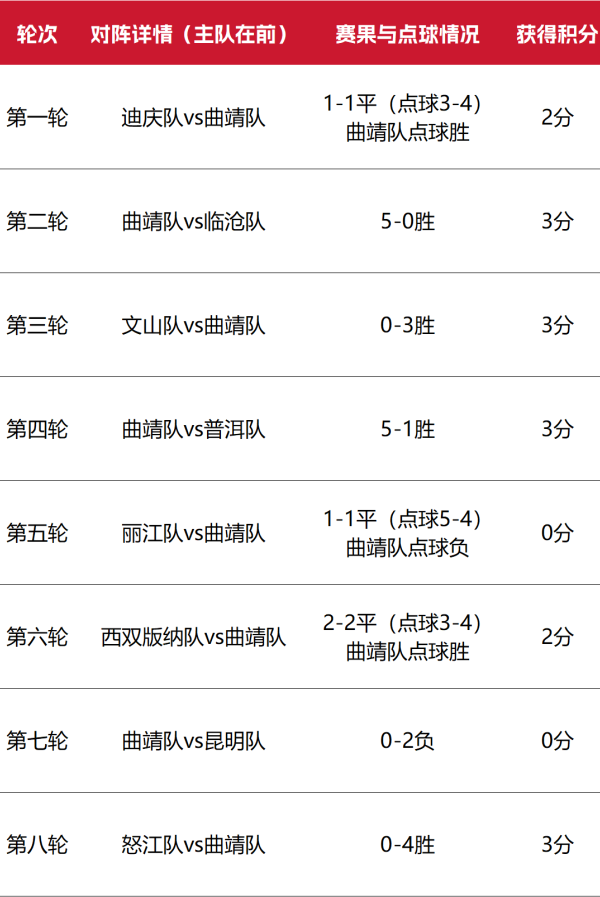 曲靖队半程交出4胜2点球胜2负的战绩,两场失利均来自对阵积分榜前二的丽江、昆明两大顶级强队,面对其余对手保持不败,整体实力稳居联赛上游。球队进攻端火力强劲,8轮轰入21球位列联赛进攻榜第三,进攻端多点开花,前八轮仅1场未能取得破门;核心竞争力在于极致的客场抢分能力,前8轮5个客场豪取10分,是本届赛事至今客场取分最多的球队,场均客场得分2.00分。
