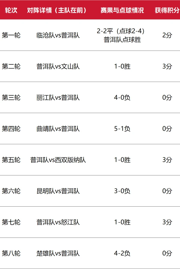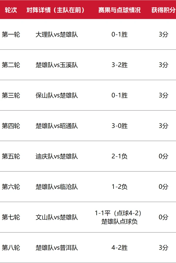 球队主客场战力均稳居联赛上游,无明显偏科:3个主场斩获6分,场均主场得分2.00分,主客场场均得分完全持平,发挥稳定性突出。球队唯一的战绩短板来自对阵榜首双雄的较量,面对丽江、昆明未能拿到积分,这是制约其当前排名上限的核心因素。