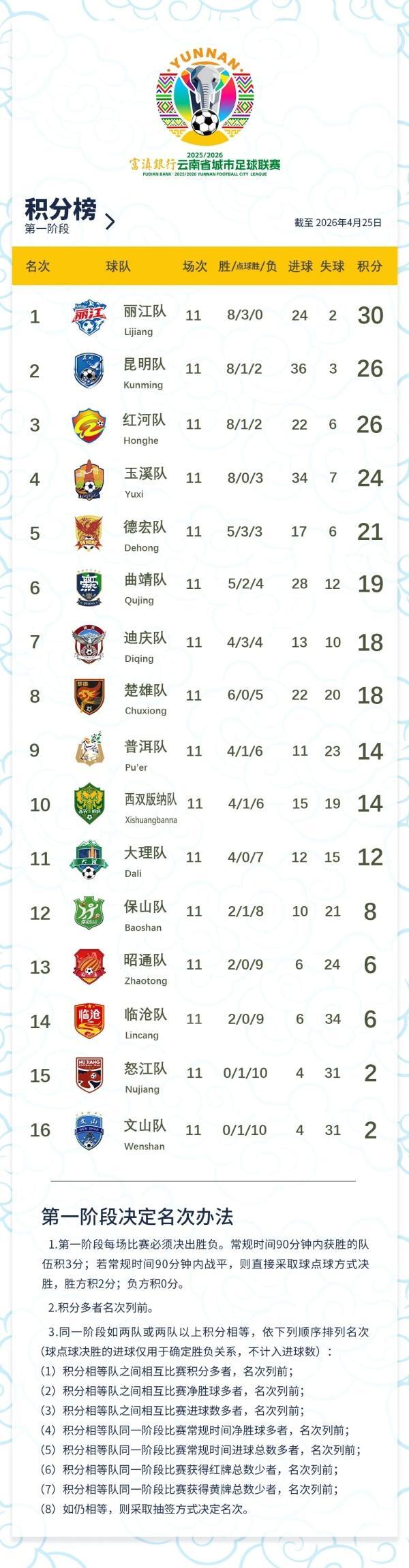 滇超联赛第十一轮8场较量已全部战罢,本轮赛事多点开花,联赛积分榜格局迎来大幅震荡。榜首丽江队4:0大胜怒江队,延续开赛以来的不败金身,豪取联赛十一连胜,继续以绝对优势稳居积分榜头名;昆明队5:0横扫楚雄队,凭借本场大胜带来的净胜球优势,反超本轮常规时间与西双版纳0:0战平、仅通过点球大战涉险过关拿到2个积分的红河队,重返积分榜次席;玉溪队2:0击败文山队,豪取五连胜,继续稳固自身积分榜前四的排位。
