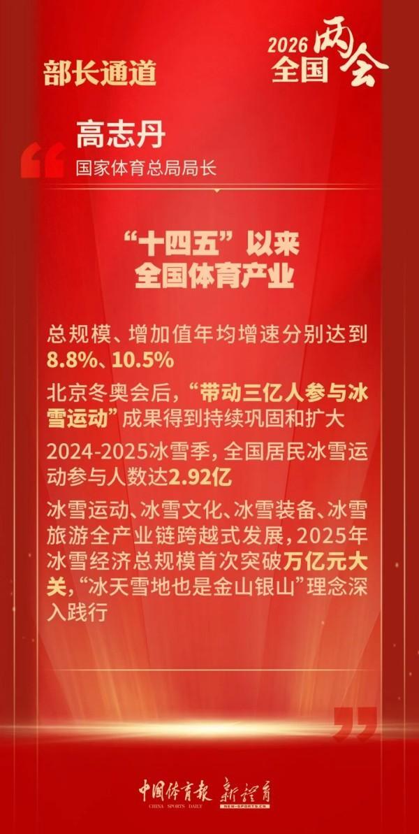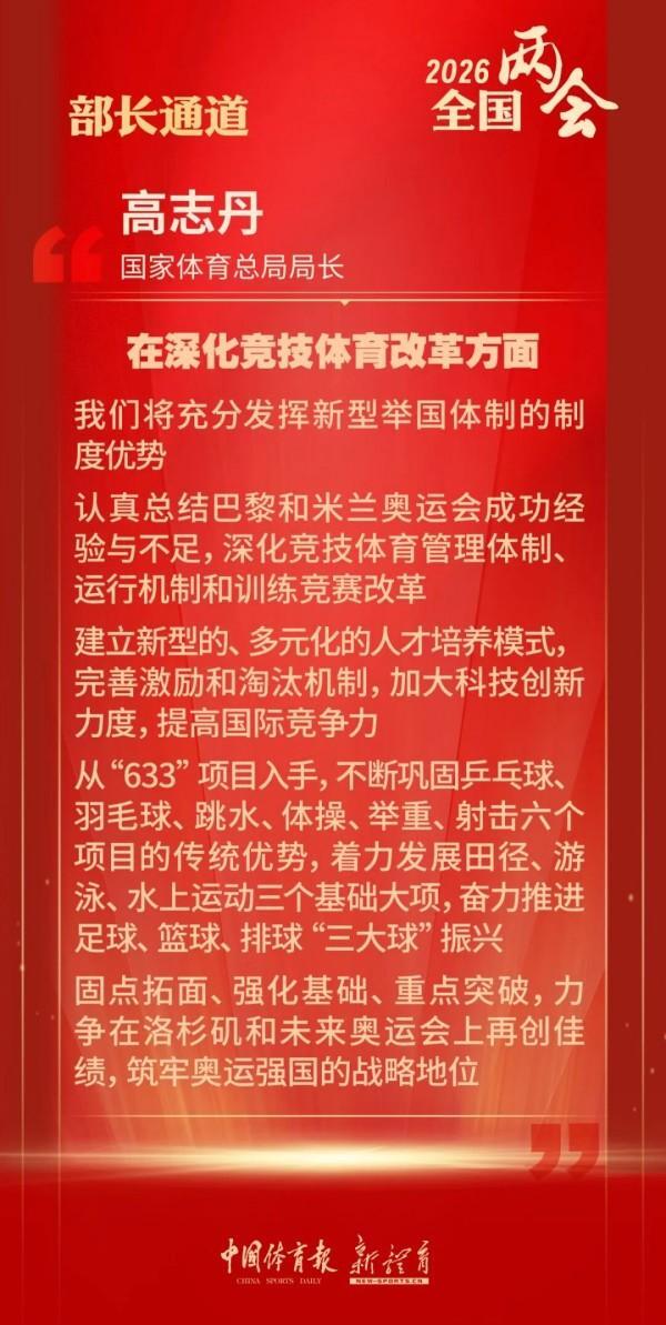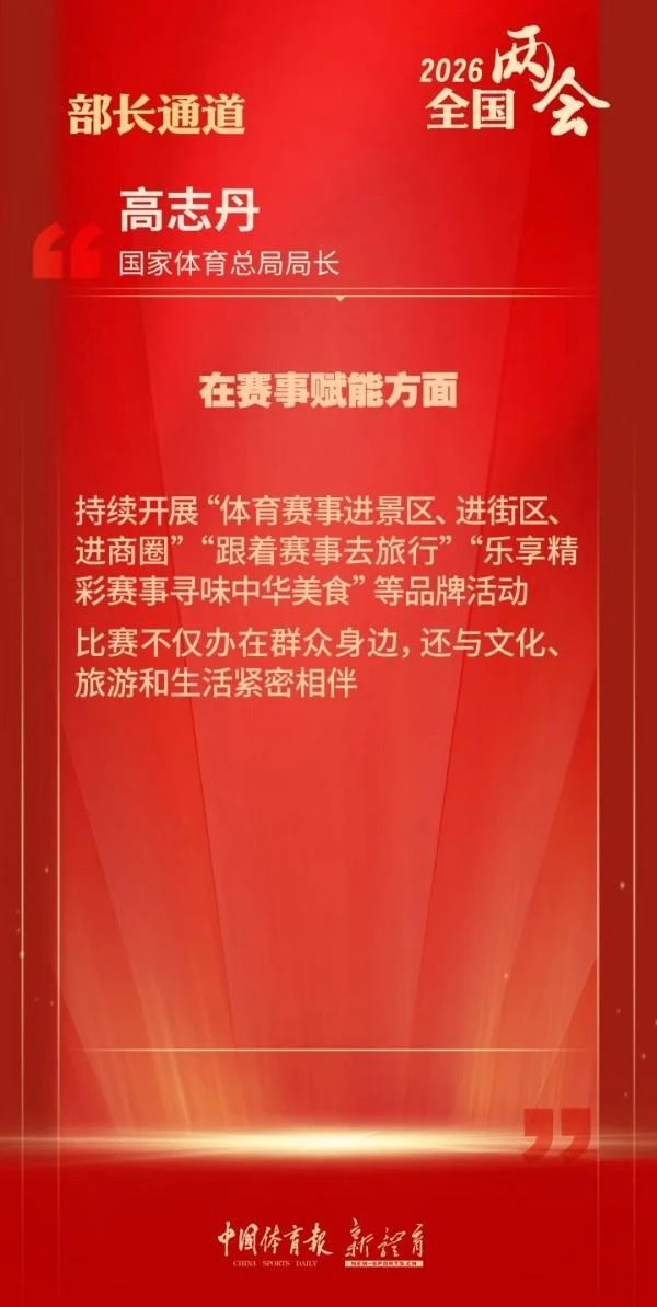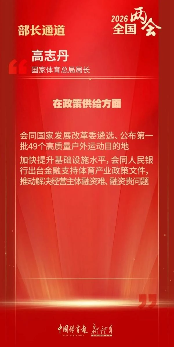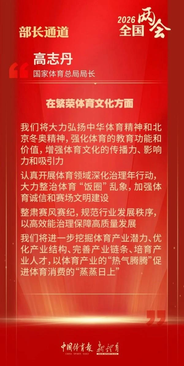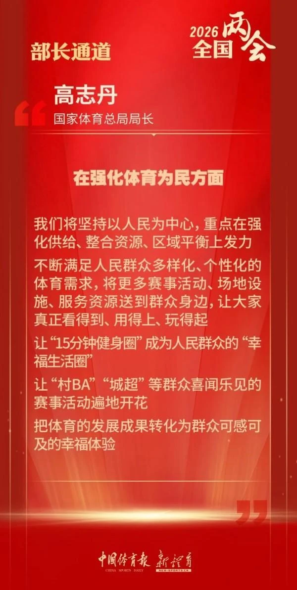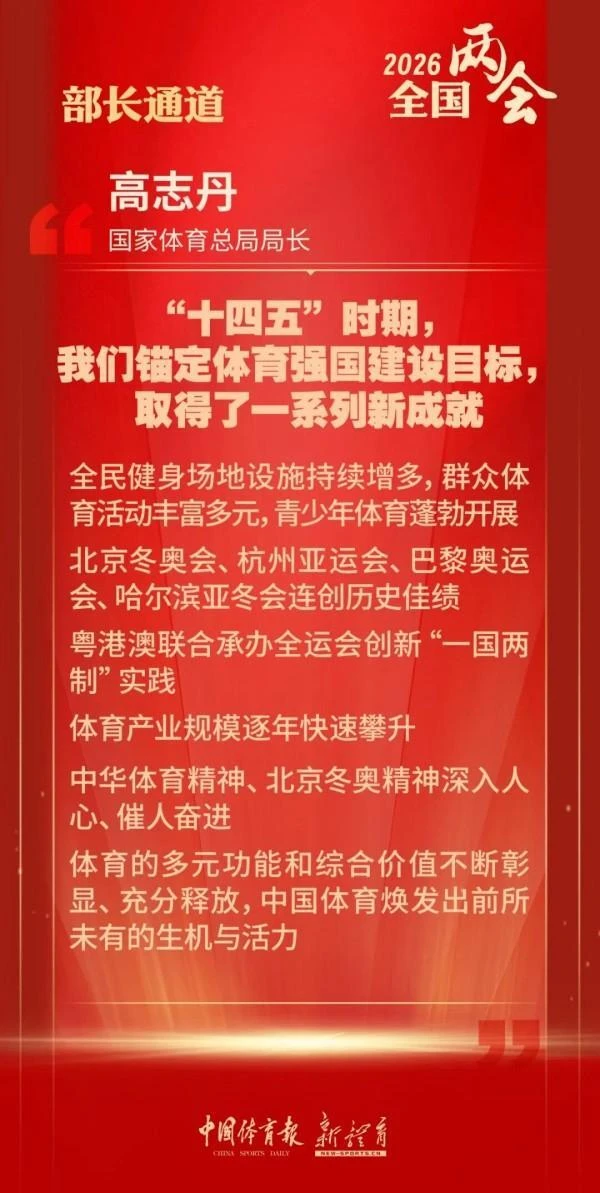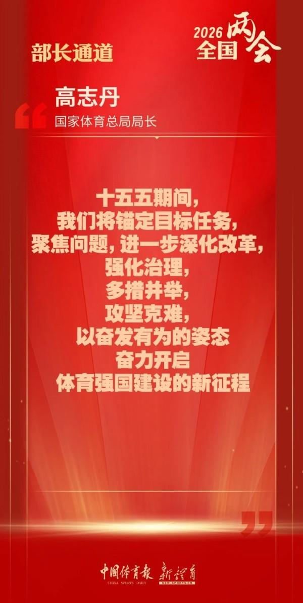3月9日,十四届全国人大四次会议“部长通道”上,国家体育总局局长高志丹就“十五五”体育发展新举措、体育产业高质量发展等社会关心的问题回答记者提问,系统阐述未来体育工作的发展方向与实践路径,为加快推进体育强国建设凝聚共识、擘画蓝图。体育强国建设道路上,每个人都是参与者、实践者、见证者,希望大家一起携手努力,共建体育强国!