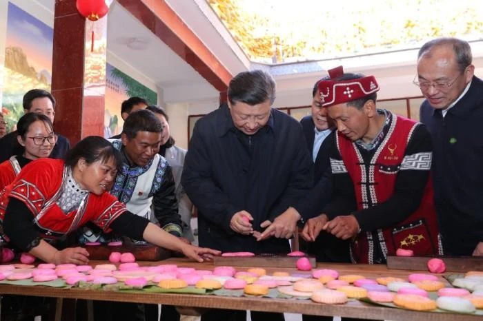 2020年1月19日,习近平总书记在云南腾冲市清水乡三家村中寨司莫拉佤族村,同村民李发顺一家制作当地节日传统食品大米粑粑。新华社记者 鞠鹏 摄