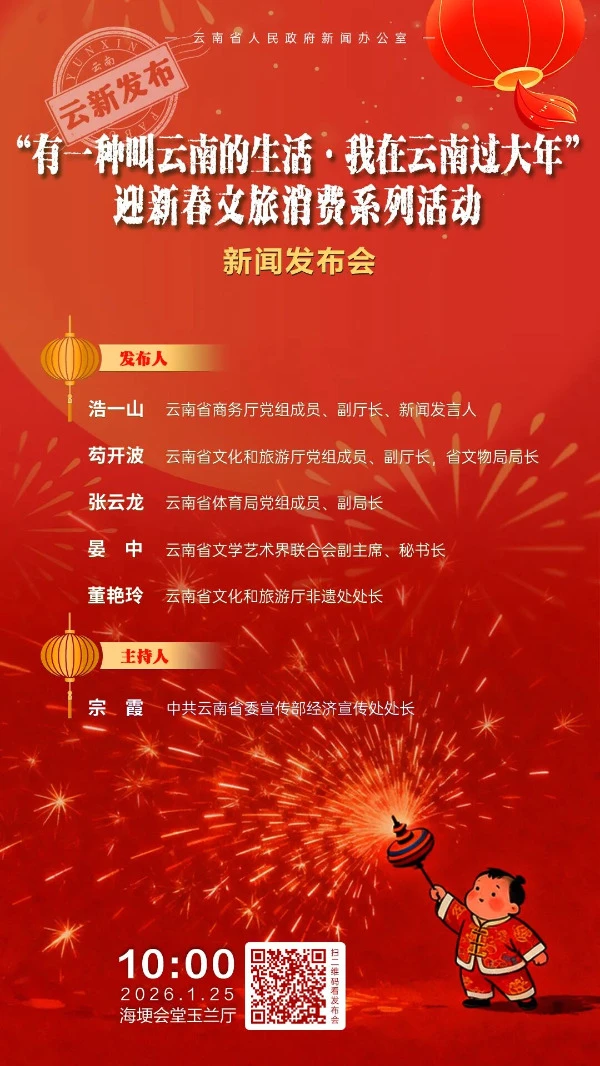 1月25日,云南省人民政府新闻办公室在云南海埂会堂举行“有一种叫云南的生活·我在云南过大年”迎新春文旅消费系列活动新闻发布会,介绍2026年春节期间系列活动的有关安排情况并回答记者提问。