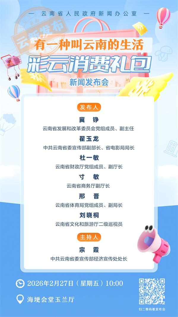 2月27日上午,云南省人民政府新闻办公室在云南海埂会堂玉兰厅,举行“有一种叫云南的生活·彩云消费礼包”新闻发布会,介绍有关情况并回答记者提问。